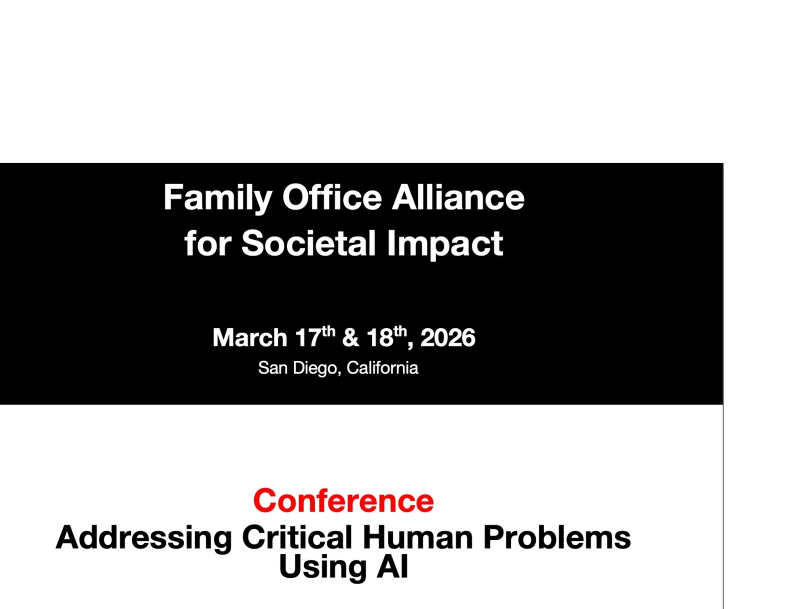 On March 17–18, 2026, we will convene in San Diego for the inaugural conference of the Family Office Alliance for Societal Impact: “Addressing Critical Human Problems Using AI.” This invitation-only gathering will bring together faculty from world-renowned institutions—including Stanford, MIT, Wharton, Harvard, Columbia, and UC San Diego—alongside senior executives from leading technology, AI, venture, and influential family office thought leaders.