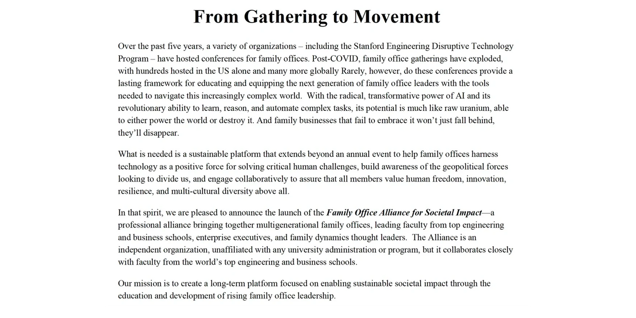 Our mission is to create a long-term sustainable platform enabling societal impact through education and development of multi-generational family office leadership.